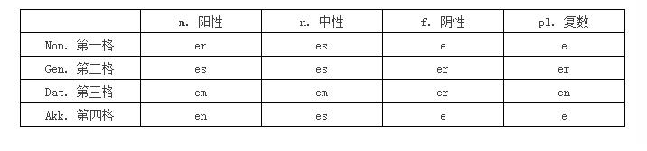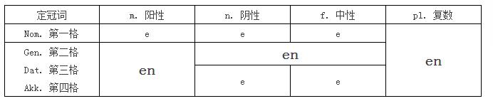 4: 形容词前有定冠词 ( 有没有发现,这个表里只有een,记住Johnson三句话:复数闭眼填-en,与格无关;第二、三格闭眼填-en,与词性无关;阳性第四格闭眼填-en;其余都是-e,屡试不爽,我个人从不死背表格 )